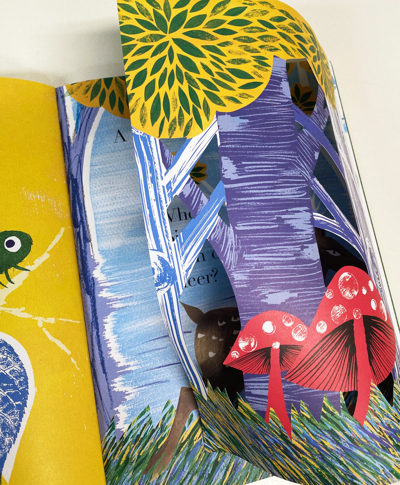 最初に登場するのはアリ。AのAntからスタートして、「アリよりきれいなのは?」、答えはBで始まるButterfly、「バタフライよりたくさんの脚をもっているのは?」、それはCで始まるCaterpillarと、比較級のなぞなぞがZまで続きます。答えは次のページの花や雲や岩の陰に隠れていて、フラップをめくると次のアルファベットで始まる動物が姿を現す仕掛け絵本です。
