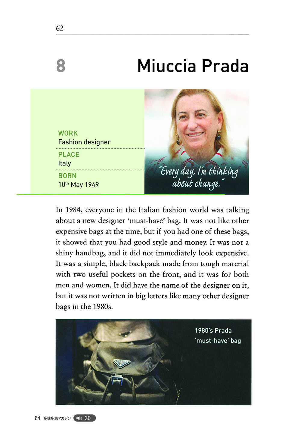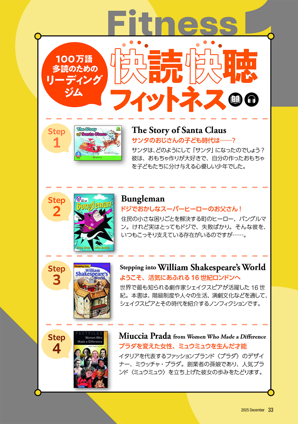 1. The Story of Santa Claus (サンタ少年は子ども用のおもちゃづくりに夢中) 2. Bungleman (Pickletonという町のご当地スーパーヒーローの秘密とは?) 3. Stepping into William Shakespeare's World (シェイクスピアが生きた時代を紹介するノンフィクション) 4. Miuccia Prada (プラダ創業者の孫、ミウッチャ・プラダが新ブランドMiu Miuを立ち上げて)