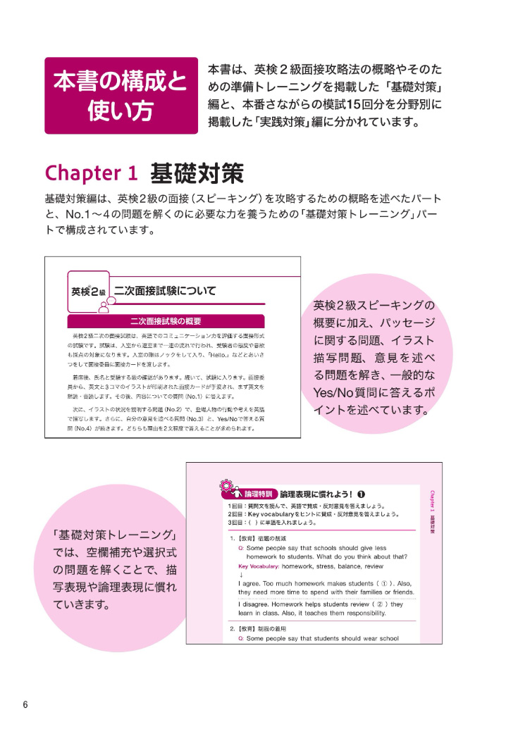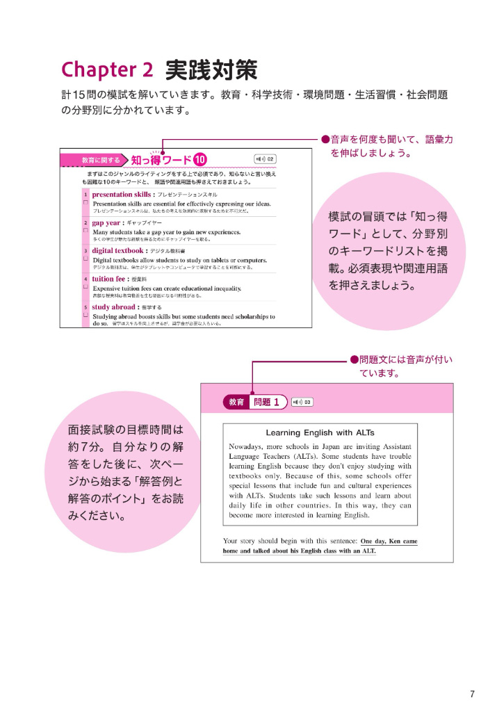 一次試験の合格発表から二次面接試験までは2週間弱。短期間で数多く模擬試験を受け、どんな分野の問題が出ても対応できるように準備することが大切です。本書は模試15回に加え、追加の5回分をPDFで提供します。二次試験のスピーキングはわずか7分間の勝負。万全の準備で本番に臨みましょう。