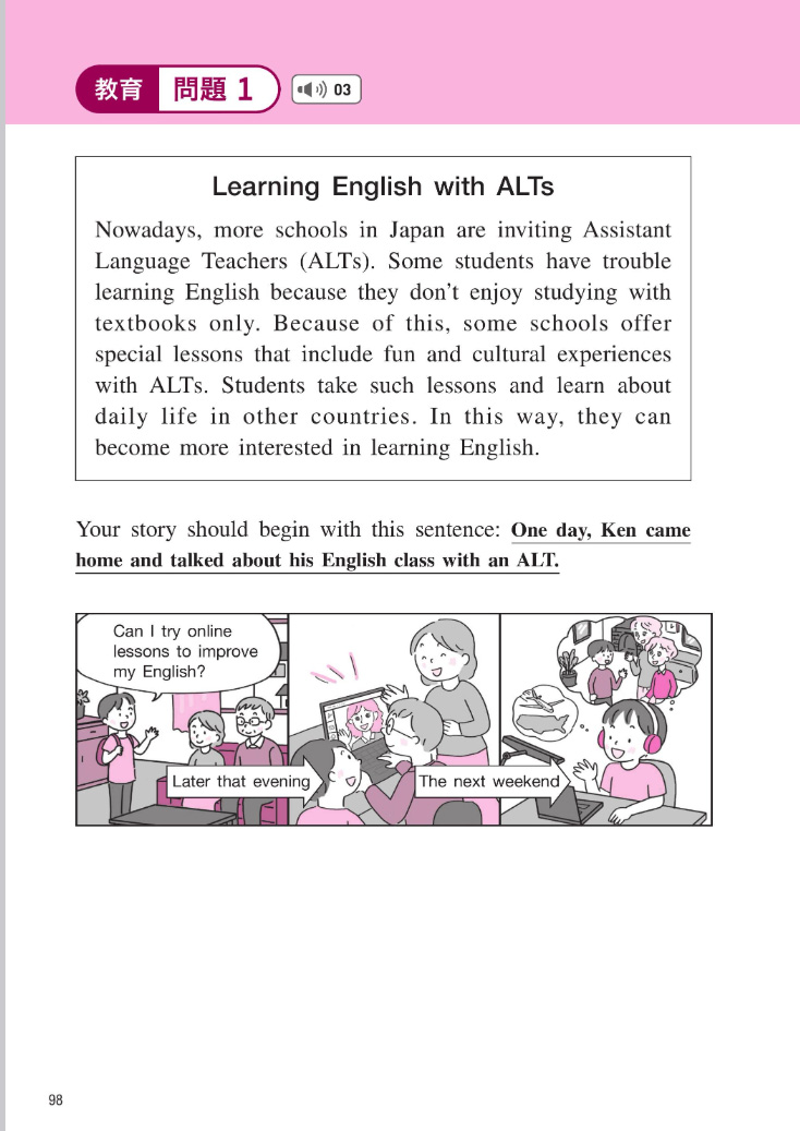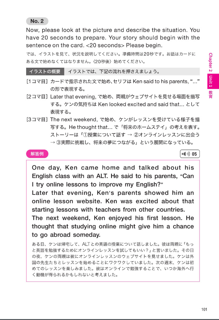 模試に入る前の準備段階として、見た状況をわかりやすく説明し、人間関係や感情などを表現する「描写力」の特訓問題115問と、自分の意見を理由とともに述べる「論理力」を鍛える問題60問を設けています。過去時制や直接話法を使って客観的に描写する力、瞬時に自分の立場を明確にして理由や具体例を添えて論理的に伝える力を養うトレーニングです。