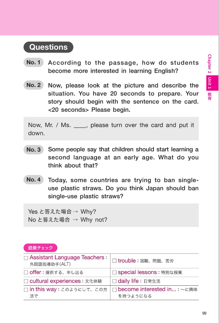 二次試験ではカードを渡されるまで、また面接官の質問を聞くまで、どんなテーマの問題が出されるかわかりません。そこで、幅広いテーマの問題を準備し、何を聞かれても自分の意見を明確に相手に伝えられるようにトレーニングします。