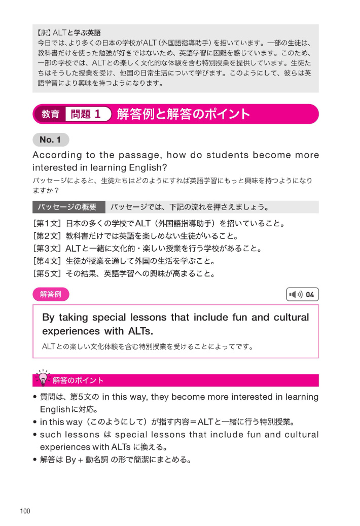 英検で頻出の「教育」「科学技術」「環境問題」「生活習慣」「社会問題」の5つのテーマ別に各3つずつの模試を用意しています。賛成・反対、Yes/Noなどの解答例と森秀夫先生の詳しいポイント解説で、パッセージの流れの押さえ方や言い換え表現のコツを学びます。