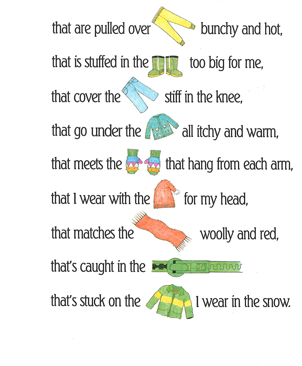 ジャケット、マフラー、帽子、手袋、セーター……。ページをめくるごとに身につけるものが増えていきます。ソリ遊びをして雪だるまにぶつかってしまい、泣き出した子どもをお母さんが助けに来てくれました。今度はマフラーをゆるめ、セーターのボタンをはずしと、服を脱いでいく表現が登場。韻を踏んだ繰り返しのフレーズが楽しめます。だんだん長くなっていく英文を、CDに合わせてうまく息継ぎして、最後までちゃんと歌えるかチャレンジ。